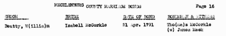 in Mecklenberg Co, NC. Thomas McCorkle was the Bondsman