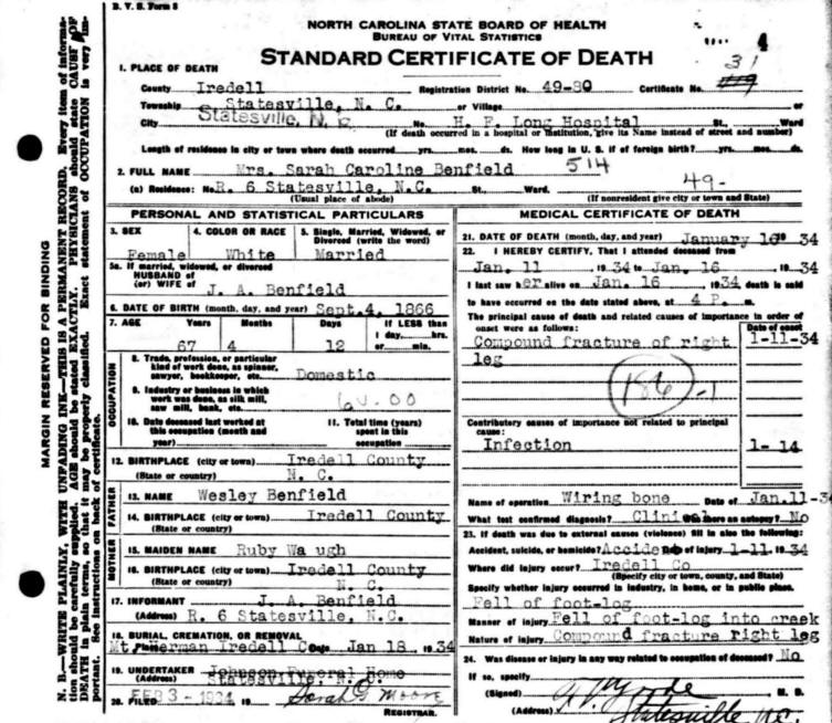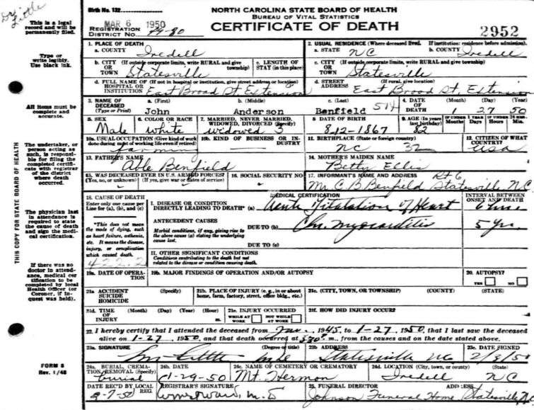 Death: 27 Jan 1950, Statesville, Iredell County, NC |