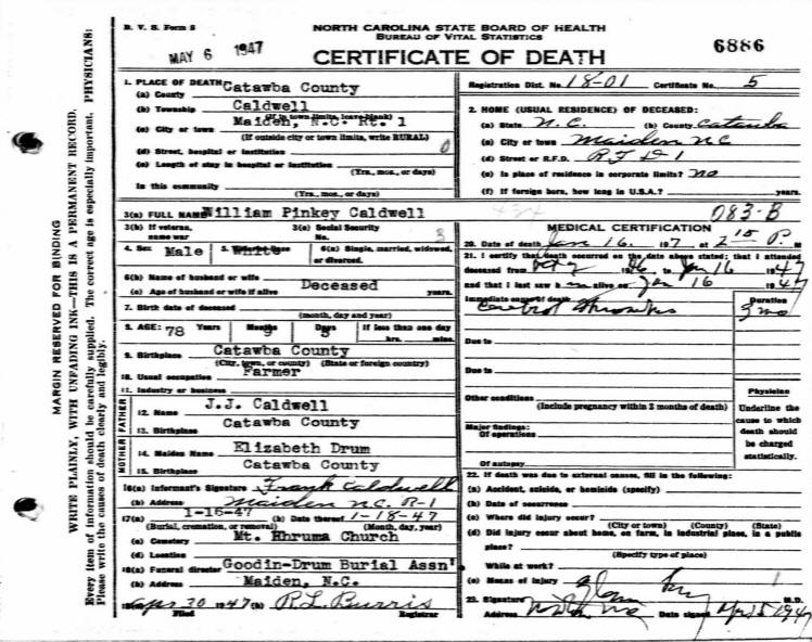 William "Bill" Pinkney Caldwell died on 16 Jan 1947 in Catawba County, NC,