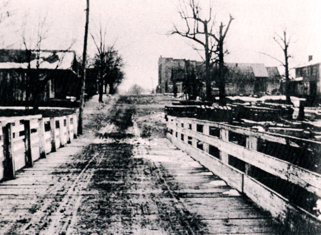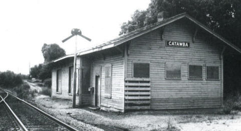 Below is a winter view of the wooden bridge crossing the railroad tracks into Catawba around 1900. |