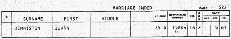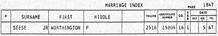 Marriage Index for JoAnn Denniston and Worthington F. Seese,