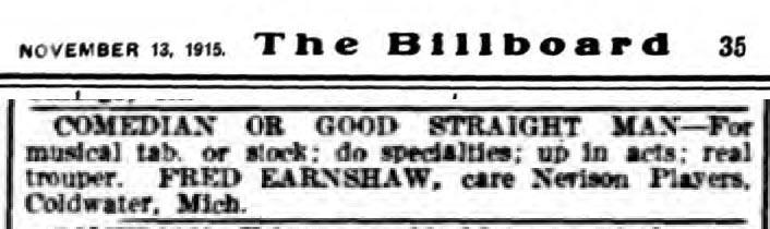 This 13 Nov 1915 ad from THE BILLBOARD, shows that Fred is