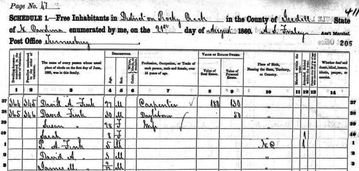 The 1850 Census lists this son as Daniel A. Fink instead of