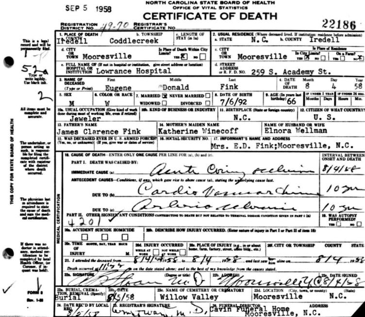 Died: 04 Aug 1958, Mooresville, Iredell, NC |