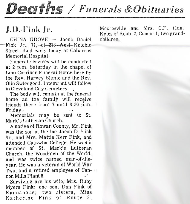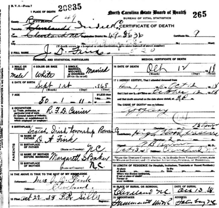 Jacob Daniel Fink died 12 Oct 1918 in Iredell
