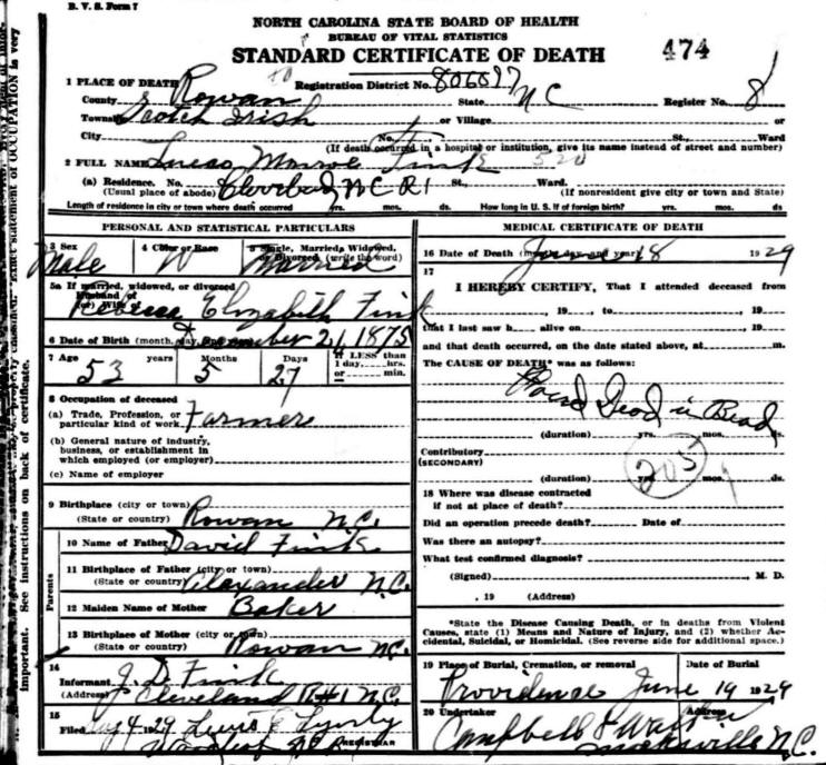 Lucas Monroe Fink died 18 Jun 1929 in Scotch Irish Township,