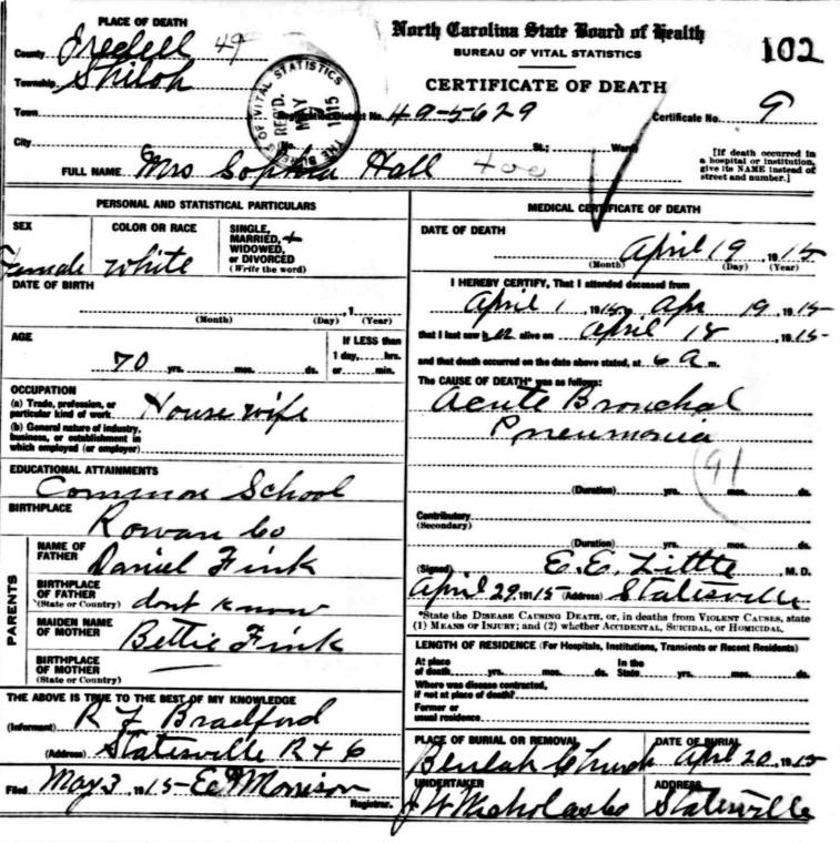 Sophia E. Fink Hall died 14 Apr 1915 in the Shiloh Township of