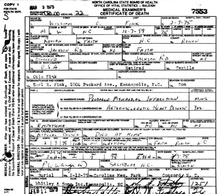 age of 75 while living at Jackson Rd., Faith, Rowan County, NC.