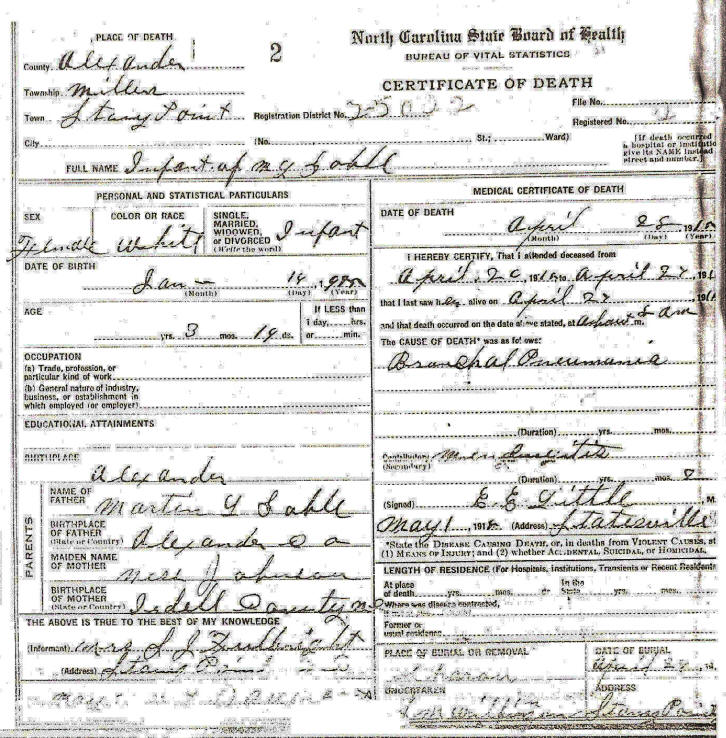 "Baby Girl" was born 09 Jan 1915 in Alexander County, NC,