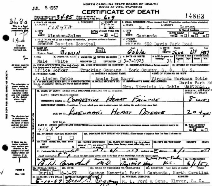 Brown Neil Goble, died 01 Jun 1959 at the age of 34 from
