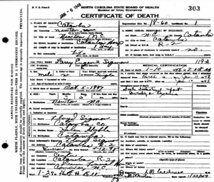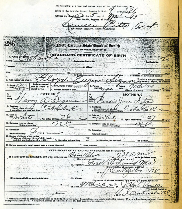 Floyd died 22 May 2005 in Catawba County, NC. He is buried