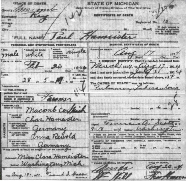 and Anna's son, Paul, died 17 Aug 1914, in Ray, Macomb County,