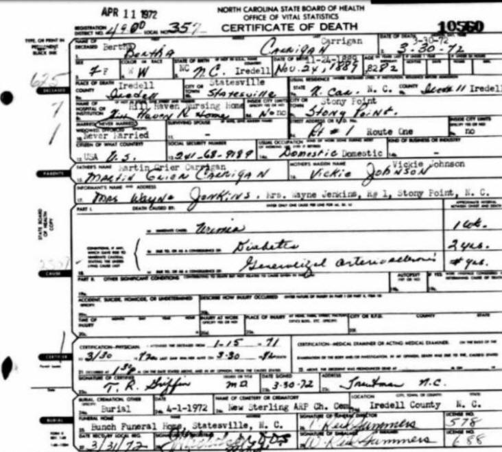 County, NC) and her death date as 30 Mar 1972 (in Statesville,