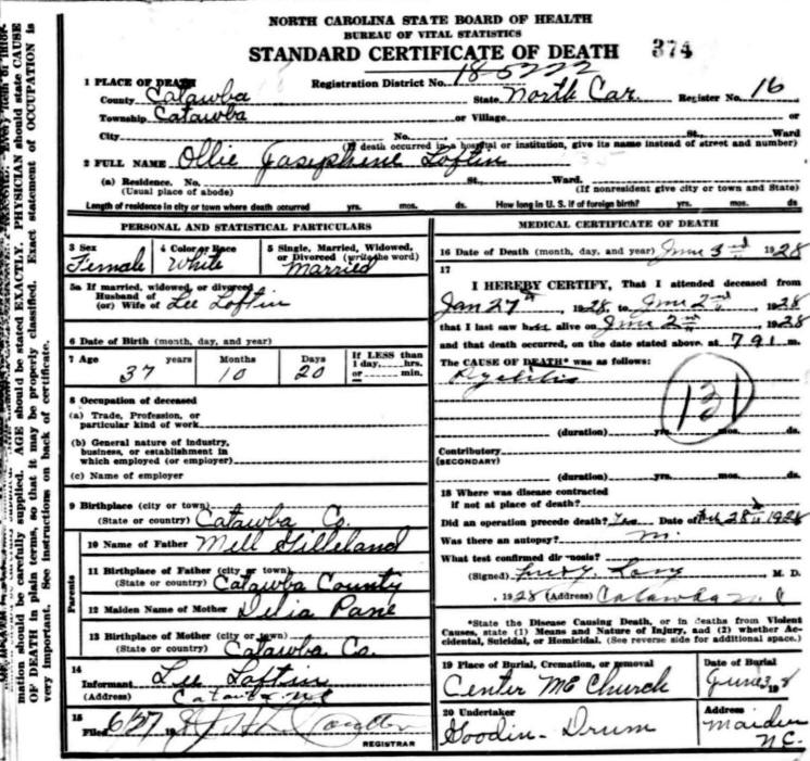 Born: 20 Jun 1884, Catawba County, NC Died: