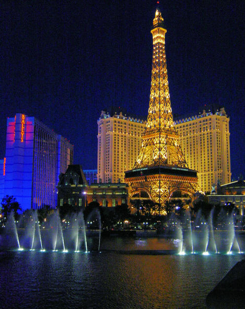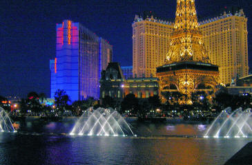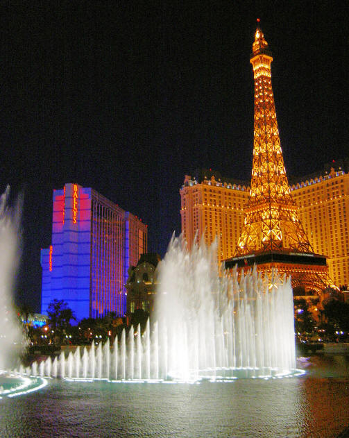 The Bellagio Fountains with the Paris Eiffel Tower in the