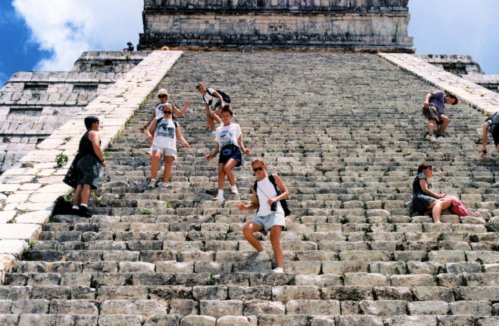 (Below) Beth, 5th from left, climbs down the steps at Chichen