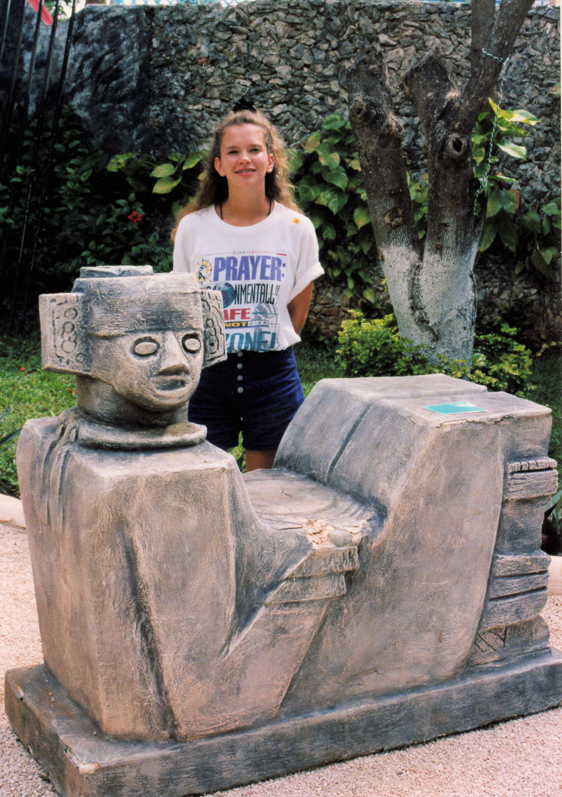 (Right) Beth poses with a stone-carved statue at Chichen Itza in