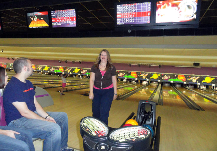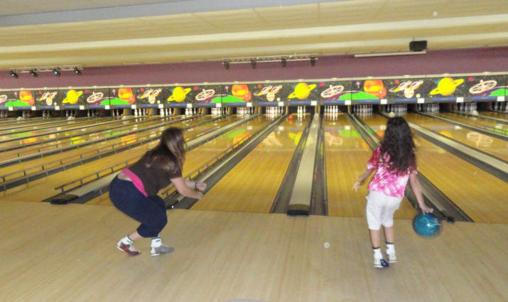 family bowling outing with Beth, Brad, Savanna, Ali, Philip,