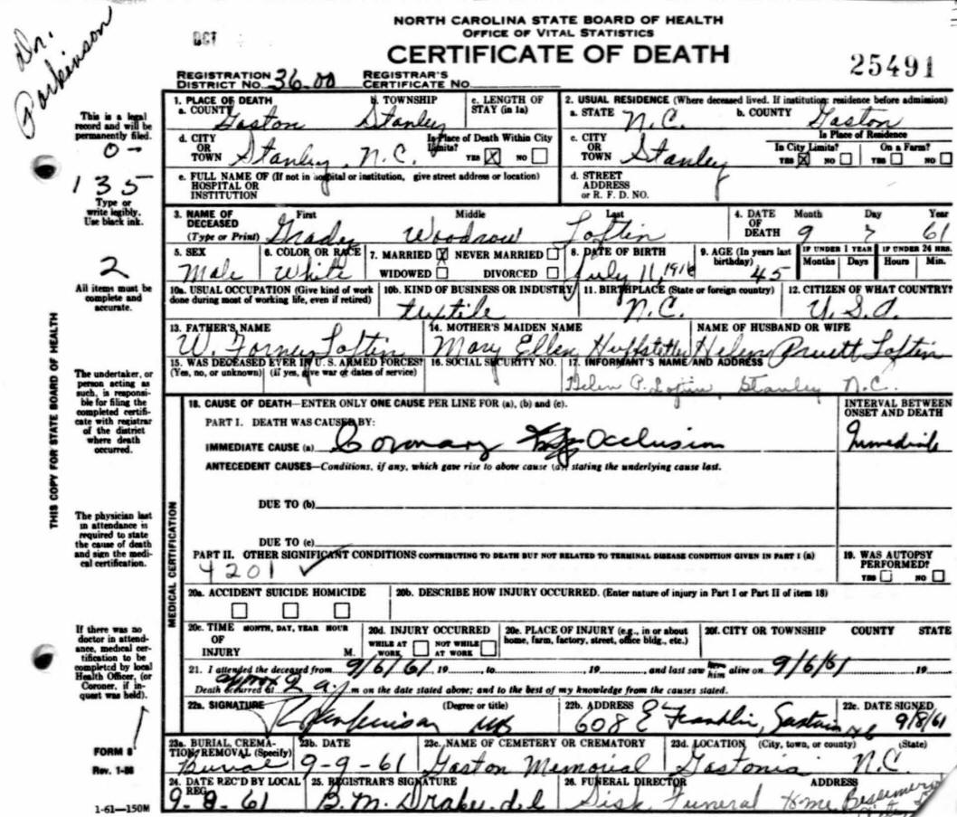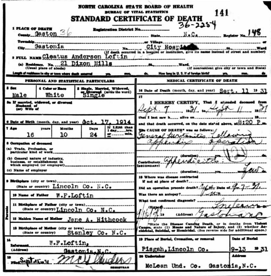 Died: 07 Sep 1961, Stanley, Gaston County, NC |