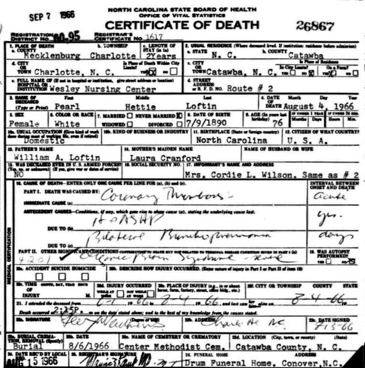 Pearl's Death Certificate shows her parents as William A. Loftin
