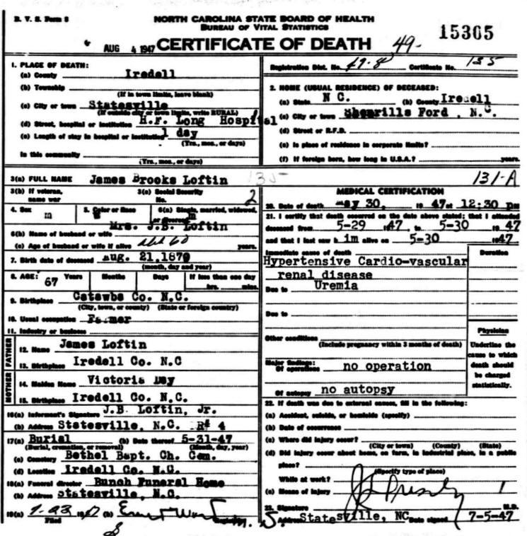 James Brooks Loftin died 30 May 1947 in Statesville, Iredell