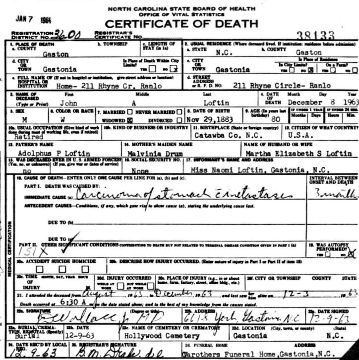 of his death and living at 211 Rhyne Circle-Ranlo, Gastonia, NC.