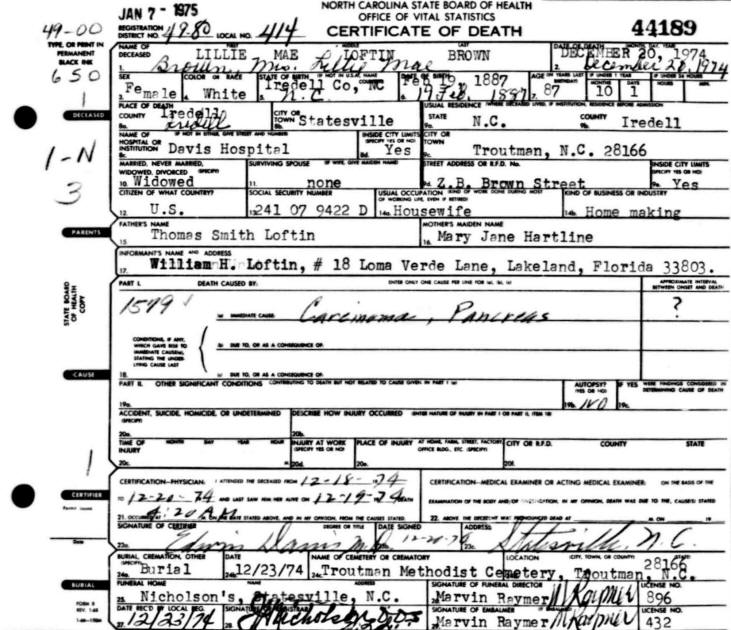 Lillie died 20 Dec 1974 at Davis Hospital in Statesville, NC,