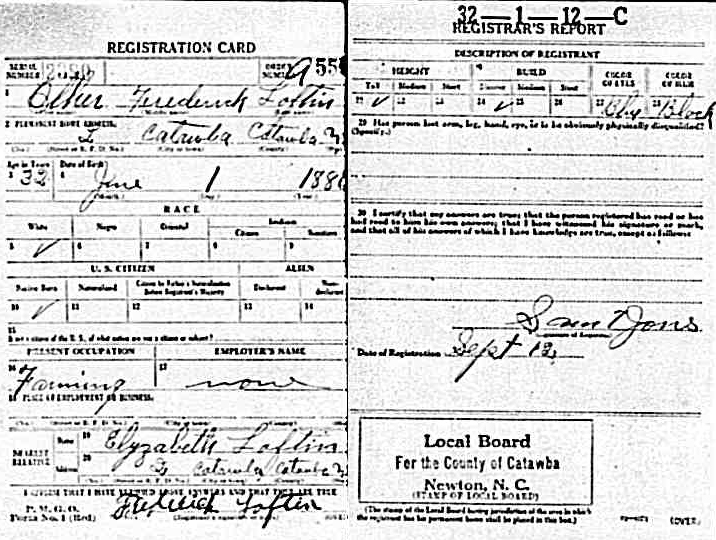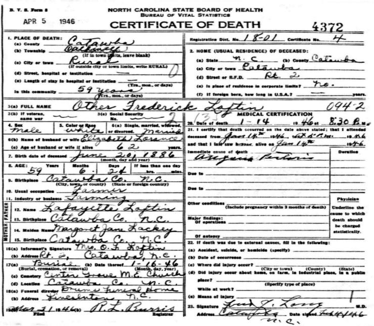 Other Frederick Loftin died 14 Jan 1946 at 8:30 PM in Catawba,