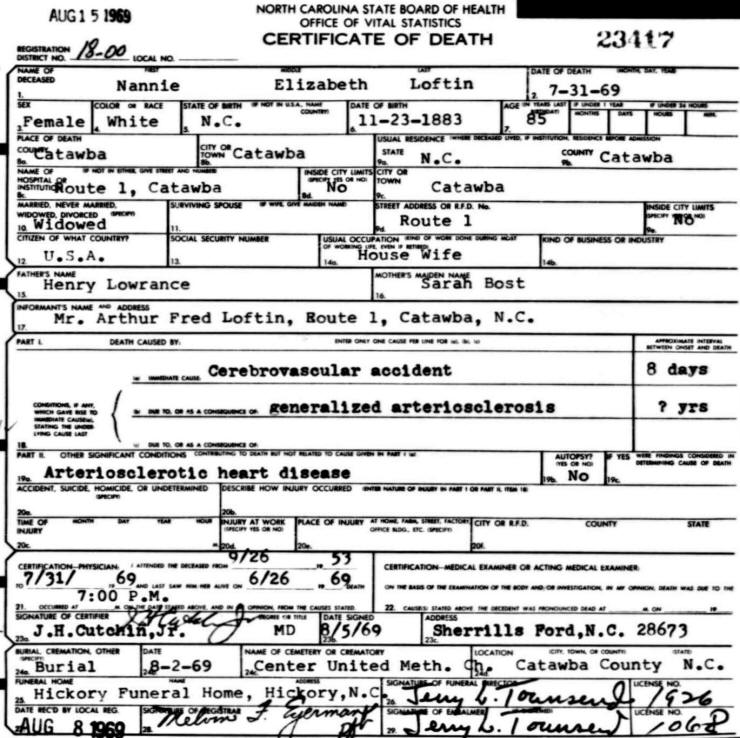 Nannie Elizabeth Lowrance Loftin died 31 Jul 1969 at the age of