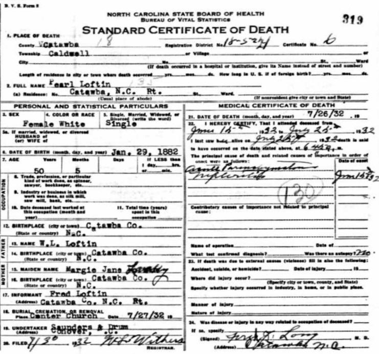 Pearl was born 29 Jan 1882 in Catawba County, NC. |