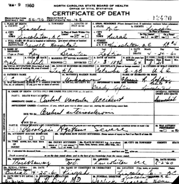 Roy Braxton Loftin died 24 Apr 1960 in Lincolnton, Lincoln
