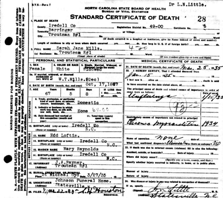 Sarah Jane died 25 Mar 1935 in Barringer Township, Troutman,