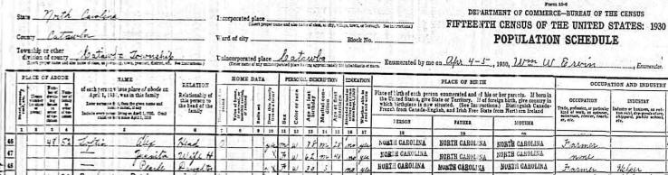The 1930 Catawba County Census listed Alex's age as 78, Juanita