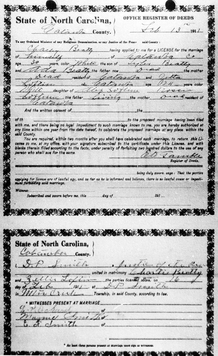 Zettie Loftin & Charles Beatty's Marriage License |