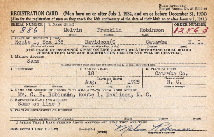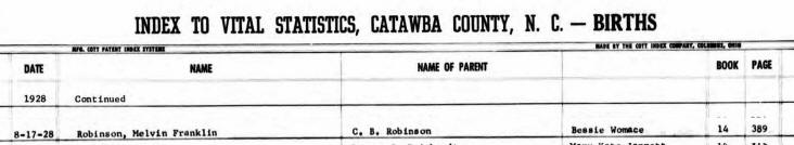 Melvin was born 17 Aug 1928 in Catawba County, NC. |