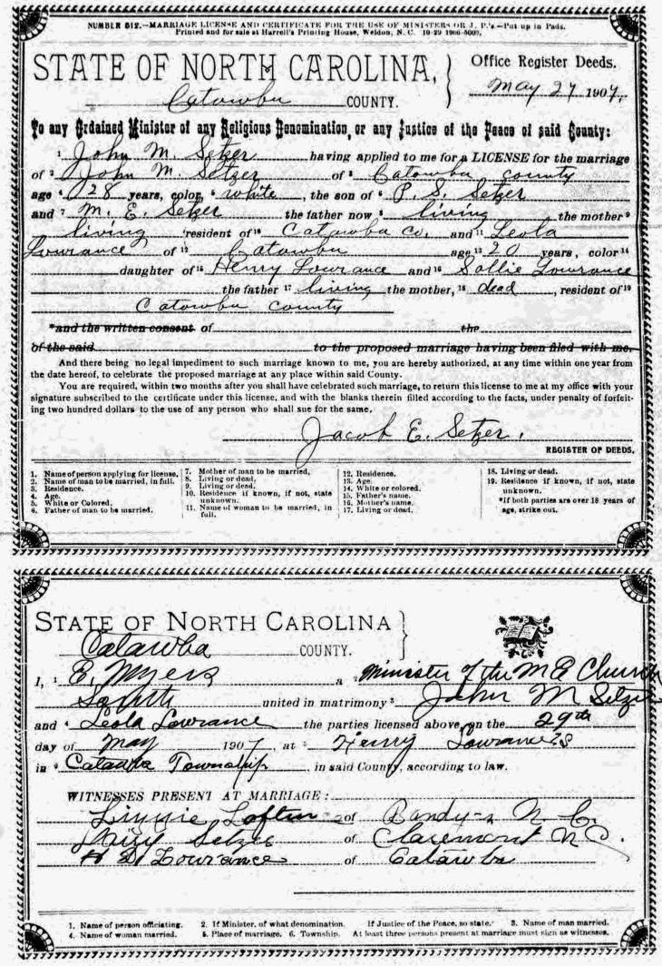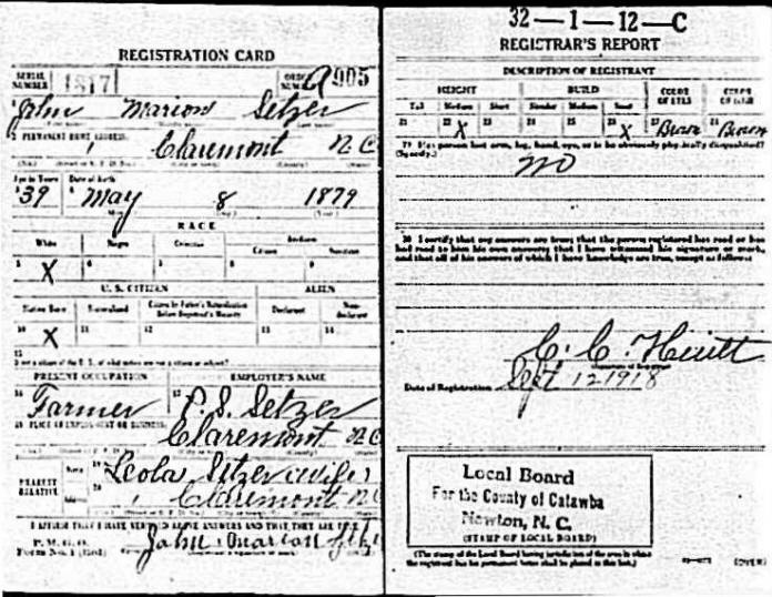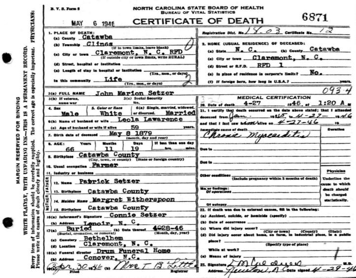 John Marion Setzer died 27 Apr 1946 in Catawba County, NC, from