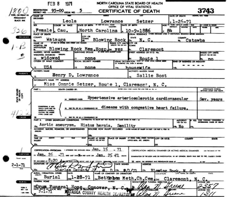 Emma Leola Lowrance Setzer died 26 Jan 1971 in Blowing Rock,