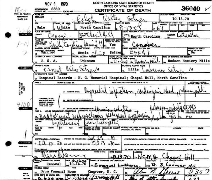 Ralph died 13 Oct 1970 in Chapel Hill, NC from a heart attack -