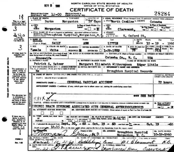 Sallie Ann Mae Setzer Little died 19 Oct 1960 in Morganton,