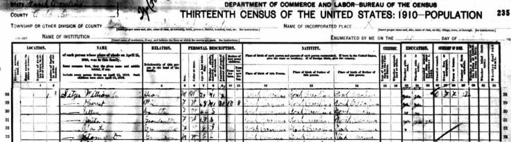 The 1910 Census shows William's age as 74 and Harriet as 68.