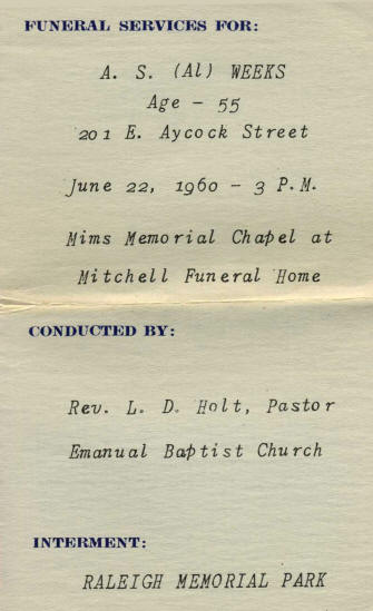 Albert Sidney Barnes Weeks died on 21 Jun 1960 in Raleigh, NC.