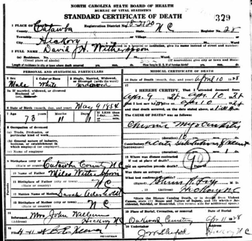 Death Certificate for David Hoyle Witherspoon |